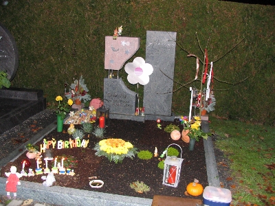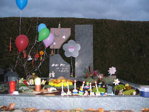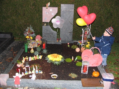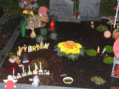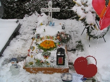 Zunächst möchten wir uns recht herzlich bei allen bedanken, die wieder an unser Geburtstagskind gedacht haben. Sina hat Geburtstag!! An den Tagen zuvor war unsere Stimmung unser Gemüht schon sehr gedrückt und besonders am Abend zuvor flossen viele Tränen. Gut das Sina´s Bruder da ist - der uns immer wieder versuchte abzulenken - was ihm auch sehr gut gelang. Am Morgen, wir wollten so führ aufstehen um zum Friedhof zu fahren, jedoch lies uns der Kleine bis um 8.30 Uhr schlafen, was sonst nicht der Fall ist. Mit einem etwas schlechten Gewissen Sina gegenüber fuhren wir sofort nach dem Aufstehen zum Friedhof. Was uns schwer viel war zu sehen, das Sinchens Garten mit sooooo viel Schnee bedeckt war. Wir fegten in weg und gestalteten ihr ihren kleinen Garten. Räumten vor Ihrem Grab und dem von Opi „Sepp“ den Schnee weg, damit keiner mit nassen Füssen dort stehen musste.